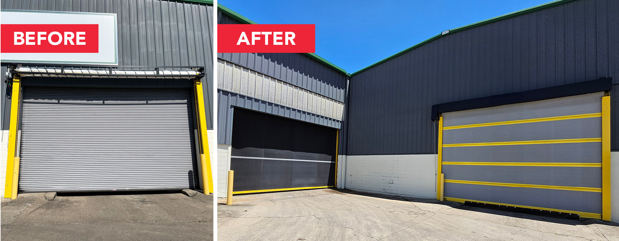 A steel fabricator was experiencing significant tempered air loss due to keeping a large door open during business hours. Due to frequent traffic through the opening and needing to keep the rolling steel door open while trucks backed into the building to unload at the interior dock, the fabricator was unhappy with the daily energy loss. Elsewhere in the facility, rolling steel doors were over 2 decades old and near the end of their lifespan.